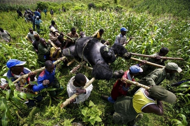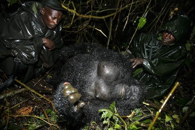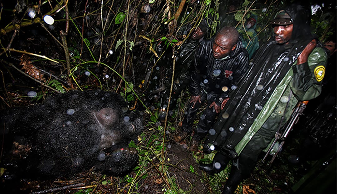 Seven mountain gorillas from the Rugendo family were murdered. This powerful image of the silverback Senkwekwe brought global attention to the horrific event.